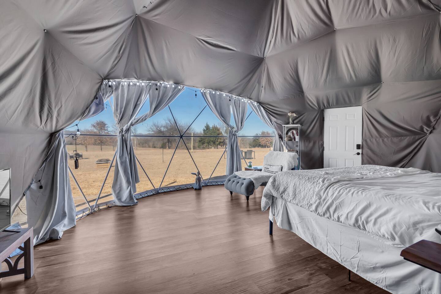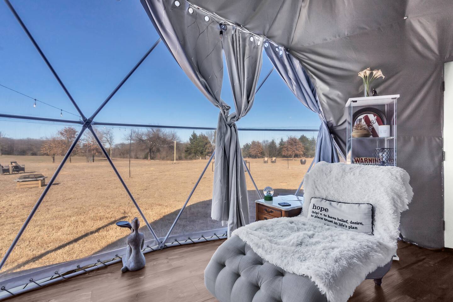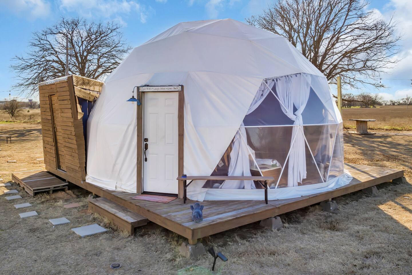 We love dogs, truly — but out of respect for future guests with allergies, we have a strict no pet policy. We must be mindful and responsible for the comfort of all guests. Thank you for understanding. Firewood and propane are guest supplied -- Please ensure fire pits are put out when you are done enjoying. 📅 Why Book Now? Because you deserve more than a break. You deserve a full reset. Highlights: • Boutique comforts with Intentional relaxation • Perfect for solo resets or romantic retreats • discounted weekday rates • Quick access to gaming, golf, concert spa, restaurants, experiences, snow cone sport's lounge - great for catching the game and more Escape the ordinary Located just 2 minutes from WinStar, and golf courses, our dome offers the perfect blend of relaxation and rejuvenation. Unwind and Recharge: Experience the magic of nature. Covered patio steps away and a firepit great for sunsets. AKA Birthday Retreat and Honeymoon Suite Find Your Oasis at The Winstar Getaway! Unique retreat steps away from the action (2 min drive, 15 min walk) at Winstar Casino! Enjoy the best of both worlds: unwind in nature with stunning views through a large picture window, while remaining closest to the casino for ultimate convenience. Relaxation meets recreation at this unique property. Water in the dome reaches a warm, comfortable shower temperature for most, but may take a few minutes to heat due to the distance from the water heater. Bonus Perks: Wellness room with fitness equipment to get your heart pumping after a day of indulgence. Stunning event dome perfect for stargazing.